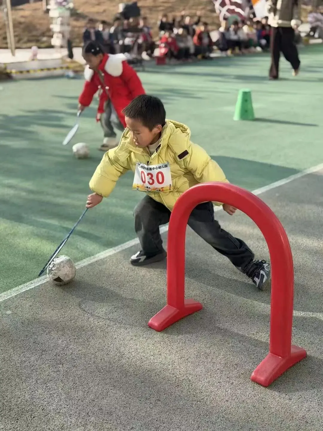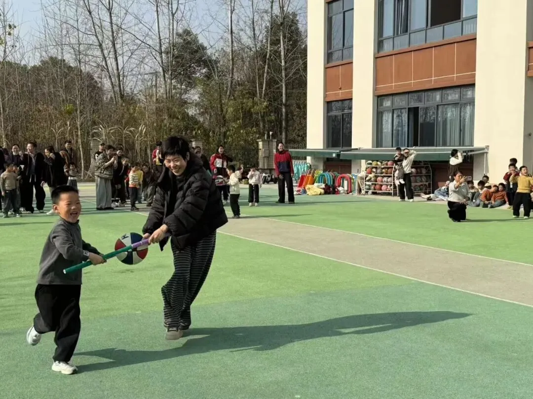 孩子们手持小棍,小心翼翼地赶着纸球“小猪”向前走。既要控制好力度不让皮球跑偏,又要加快速度赶超对手。大家眼睛紧紧盯着纸球,小碎步迈得飞快,赛场上传来阵阵加油声与欢笑声。