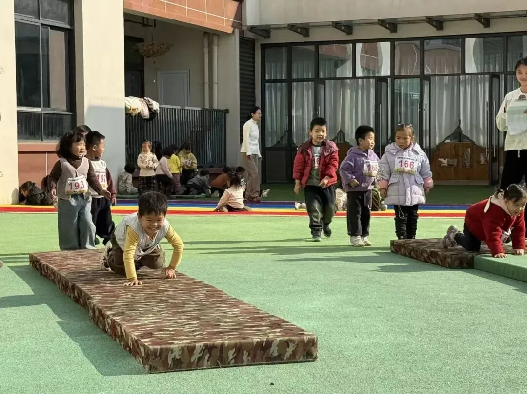 匍匐、攀爬、穿梭!萌娃们变身 “毛毛虫”,在垫子上灵活挪动小身子,使劲的样子很是可爱。