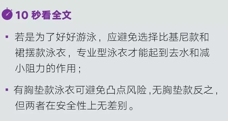 首先,请先排除掉比基尼款式,因为比基尼款式在游泳的时候,上衣会有脱落的风险,所以不建议选择。其次,请排除有小裙子的款式。因为在游泳时,人需要与水平面尽可能的平行,才可以轻松前进,小裙子不但会形成阻力,减缓前进速度,还会加大游泳学习的难度。