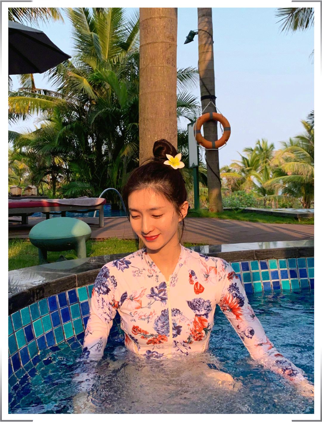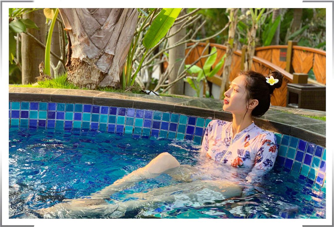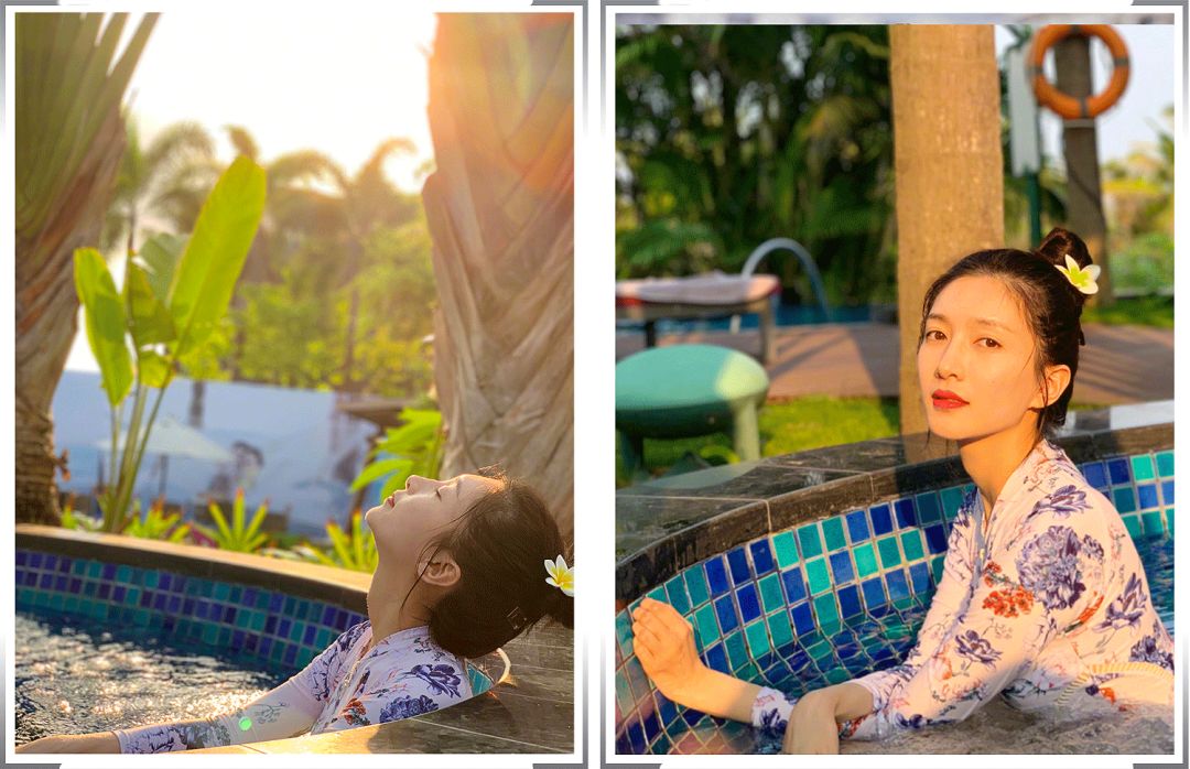 照片中她没有完全展现自己的大长腿,但在水里隐约露出一双筷子腿,又细又白又滑,真的非常遭人羡慕嫉妒了🙃