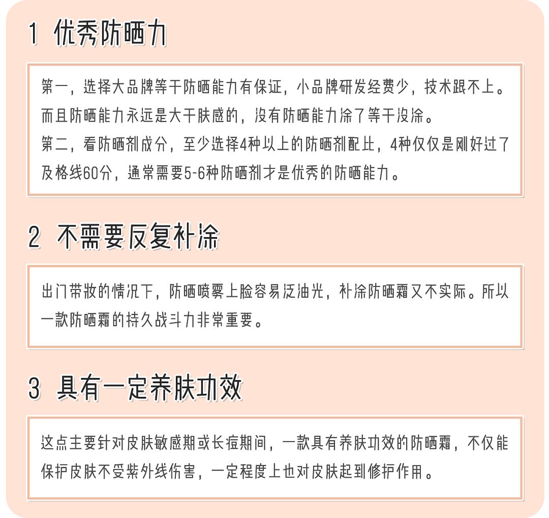 除了戴帽子戴😷等基础硬防晒,日常其实最常见的防晒手段就是涂防晒霜,就我自己用过十几种品牌的防晒霜而言,我选防晒霜无非就是看重这几点👇