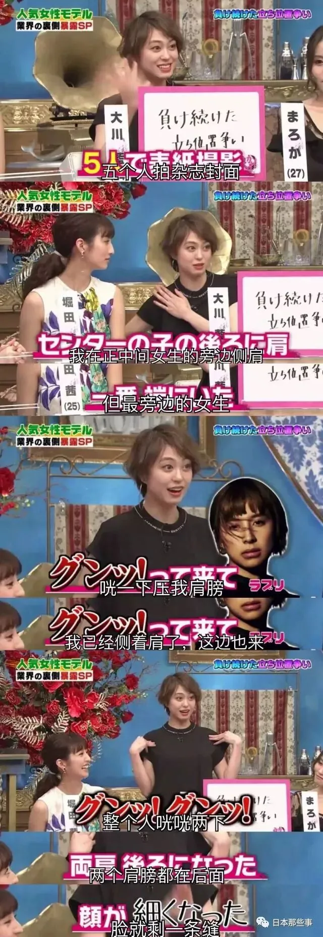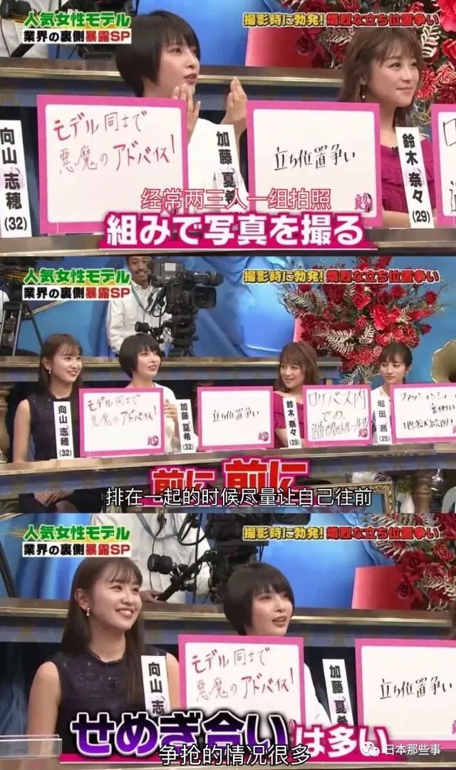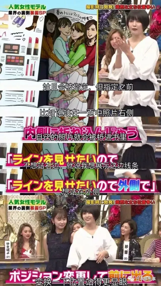 主持人又质疑说站位不会事前决定好吗,加藤回答说的确有,但站在杂志装订线一侧的话会在翻页时翻进去,所以会提前说自己想展示另外一侧的线条,从而站在更显眼的地方。