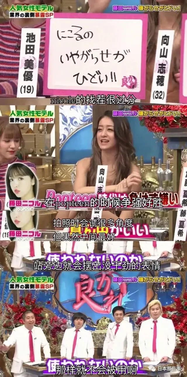 模特池田美优还实名曝光当红的藤田nicole,说她站在旁边时故意摆出没干劲的表情,从而换到中间去。