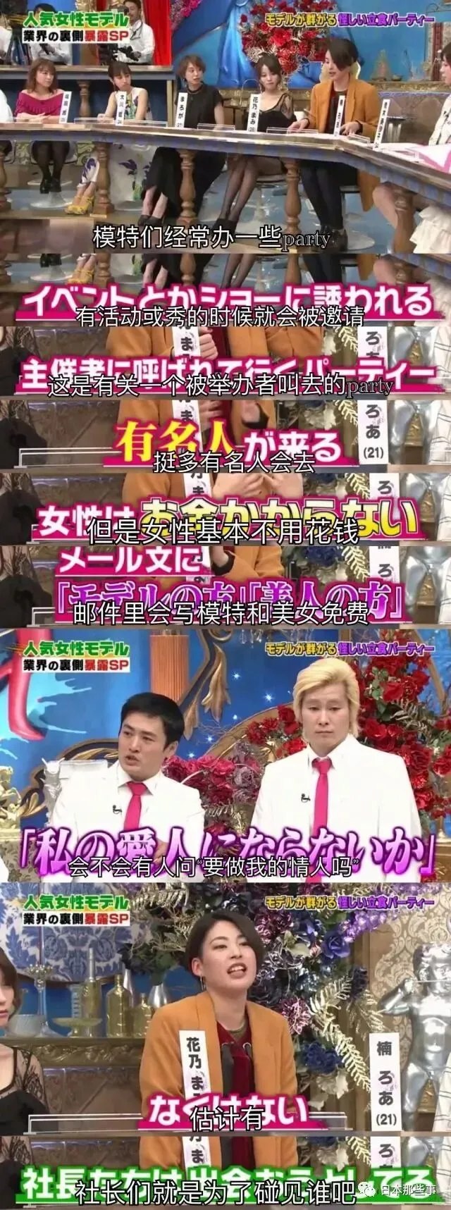 模特之间经常会办party,并且party上不乏一些社长之类的人物。模特花乃说自己曾经见过一个party的要求上写着必须是模特或者美女,然后就可以免费参加。主持人说,这些社长不会是想去找情人吧,花乃也肯定了这个说法。