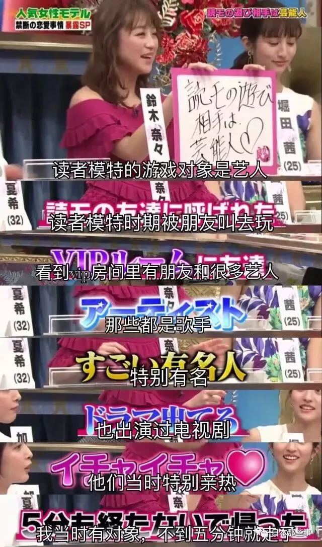 铃木奈奈说读者模特与艺人之间也经常一起“玩”,她有一次被朋友叫去时便目击到读者模特跟几个歌手亲热的场景。