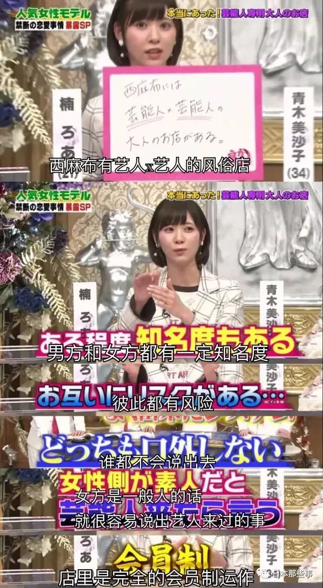 更令人震惊的是,据说在西麻布有客人和陪酒女都是艺人的风俗店,因为对有知名度的双方来讲暴露出去都有风险,因此比较保险。店内为了不走漏风声也一致采用会员制管理。