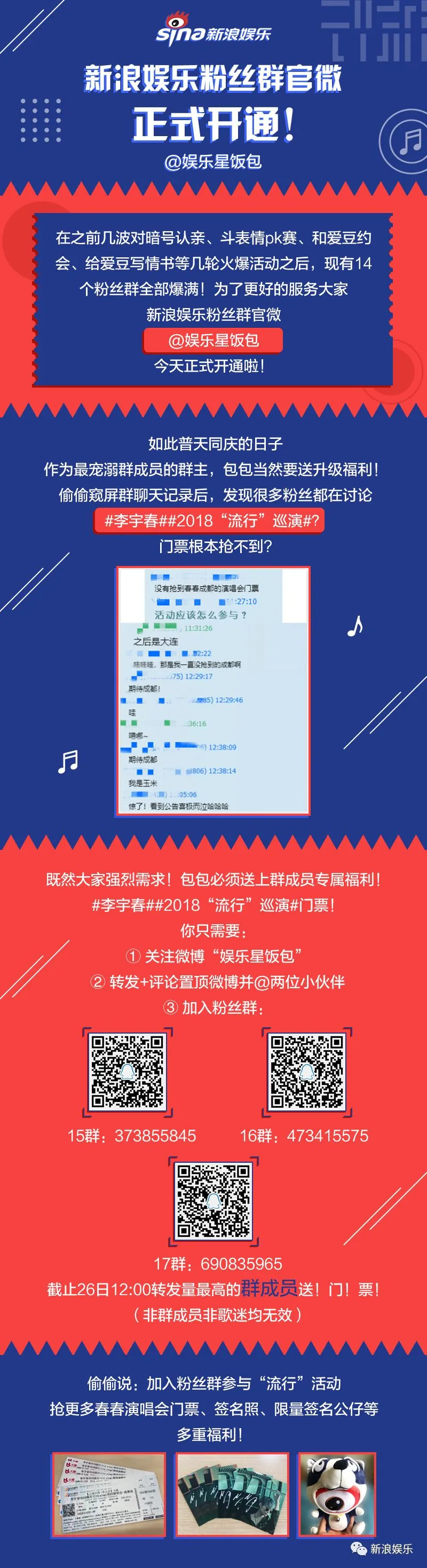 新浪娱乐粉丝群开通啦!想第一时间获取娱乐资讯吗?想认识更多志同道合的小伙伴吗?想和你的爱豆近距离接触吗?快来加入我们吧。