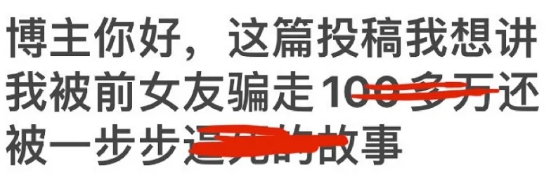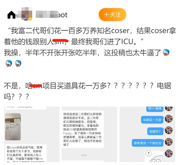 事情是这样的,瓜宝我2g网速在网上冲浪的时候,看到x博上某个bot发了一条匿名投稿,大概说自己的富二代哥们惨被一位知名女coser圈走一百多w,被绿后气进了icu的故事|д•´)!!。