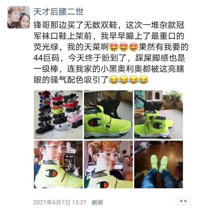 PS:我脚上这双骚气的袜口鞋,就是上面写到的冠军杂款,脚底柔软的踩屎感,极其方便穿脱的袜口,真的很值得淘一双……