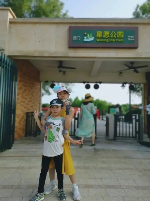 前两天去迪士尼小镇玩,儿子穿了这件最喜欢的白灰插肩款。