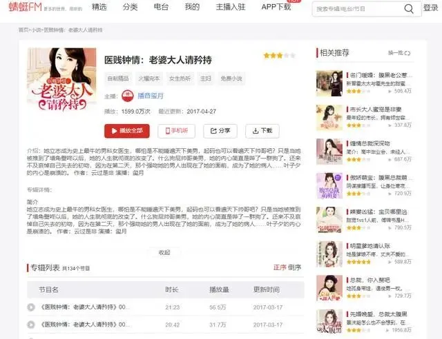 在另一大音频平台蜻蜓FM上,记者同样检索到大量带有刺激性标题的内容,比如《我和美女院长》、《医贱钟情:老婆大人请矜持》《我的绝色女老板》《夜色》等有声小说,内容简介中涉及到“身边睡着漂亮的她”、“睡遍天下美男”“陪我睡,我给你钱”等多个带有明显性暗示、性挑逗等易使人产生性联想词汇。