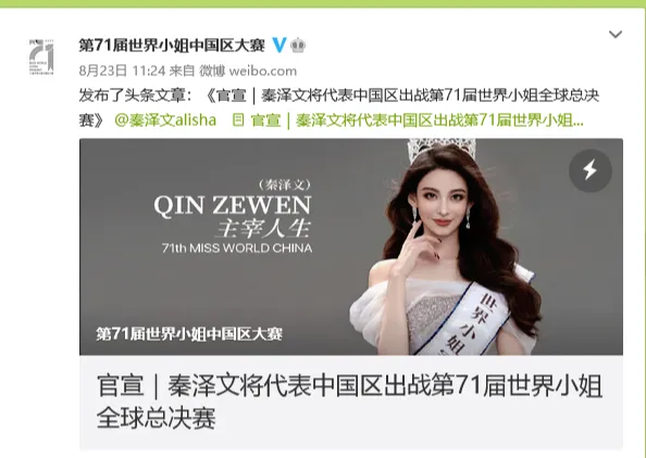 紧接着在8月22日,官宣由秦泽文代表中国区出战第71届世界小姐全球总决赛。