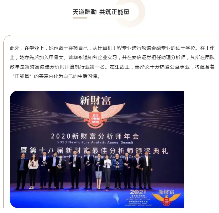 据第71届世界小姐大赛微信公众号,秦泽文,出生于1997年,从计算机工程专业跨行攻读金融专业的硕士学位,先后加入甲骨文、普华永道等企业实习,并在安信证券担任助理分析师,团队数年是新财富最佳分析师计算机行业第一名。