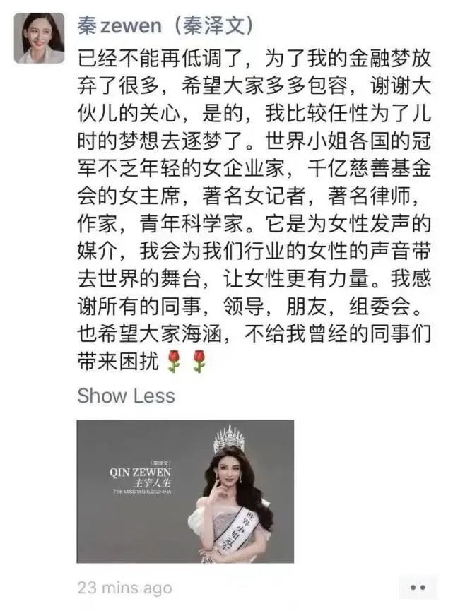 8月22日晚间,秦泽文本人曾在朋友圈回应进入世界小姐决赛一事,她表示:“谢谢大伙儿的关心,是的,我比较任性为了儿时的梦想去逐梦了。”她还表示,世界小姐各国的冠军不乏年轻的女企业家、千亿慈善基金会的女主席、著名女记者、著名律师、作家、青年科学家。它是为女性发声的媒介,她会将金融行业女性的声音带去世界的舞台。