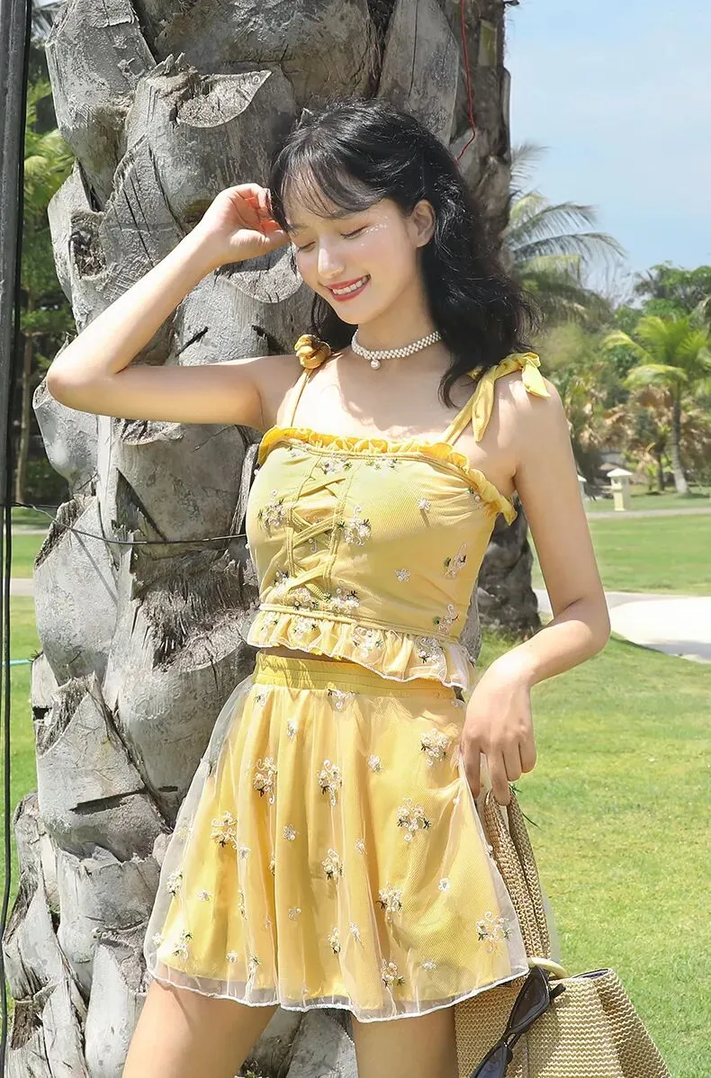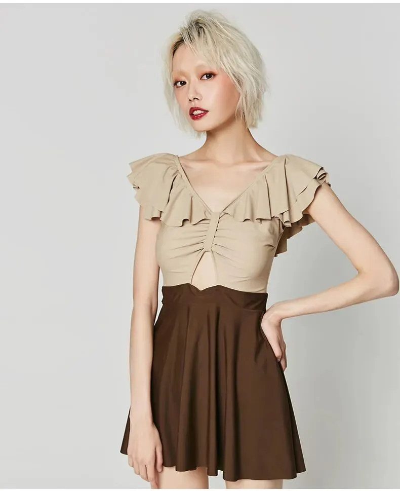 姜黄色连体泳衣既有海岛风情又有复古韵味,把慵懒柔美的浪漫气息和精致端庄的少女感融合的十分巧妙。