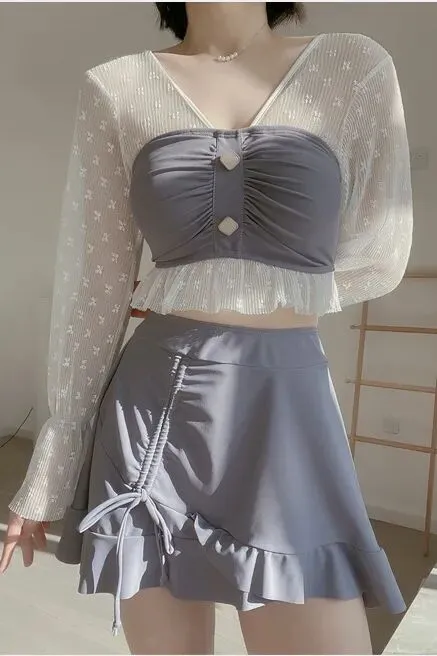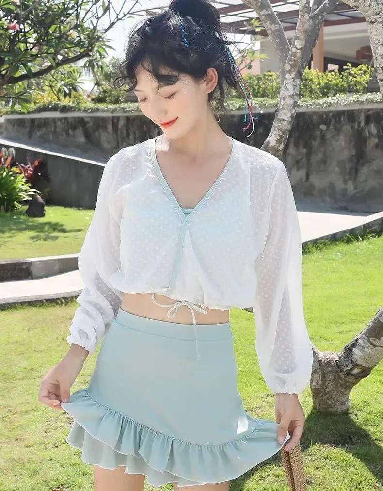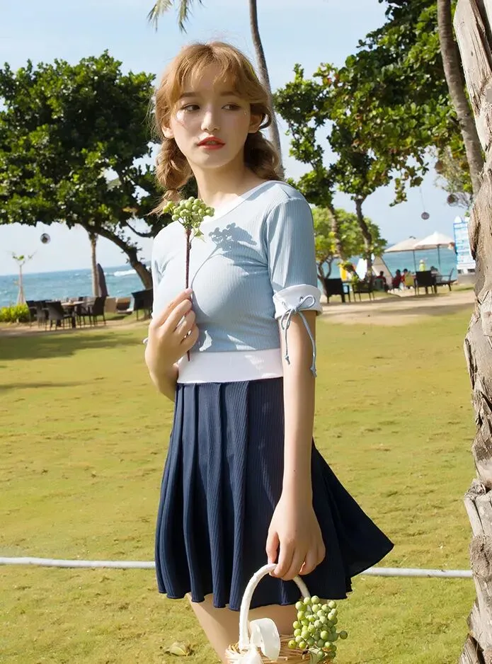 右边这套蓝色的上衣+小裙泳衣套装,如果在海岛的话真的可以穿它出门了,炒鸡日常,一点也看不出来是泳衣!