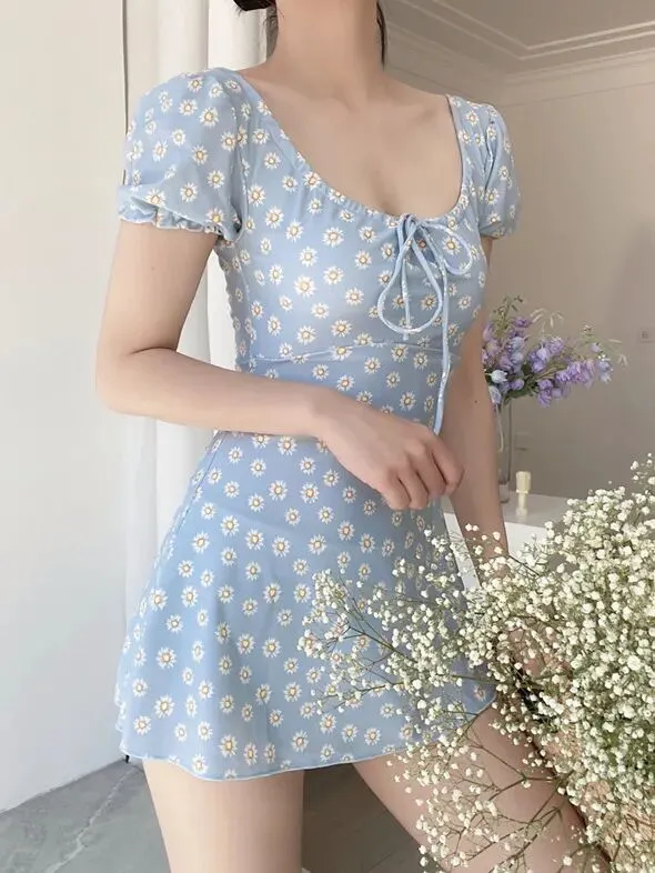 碎花连衣裙设计,很有夏天的feel,而且对微胖姐妹也很友好,收腰设计,超显身材!