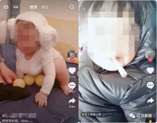 在某短视频平台上,一位父亲将两个球,塞入一岁孩子衣服里,模仿成年女性体态。更有人让孩子饮酒、抽烟、模仿成人示爱。