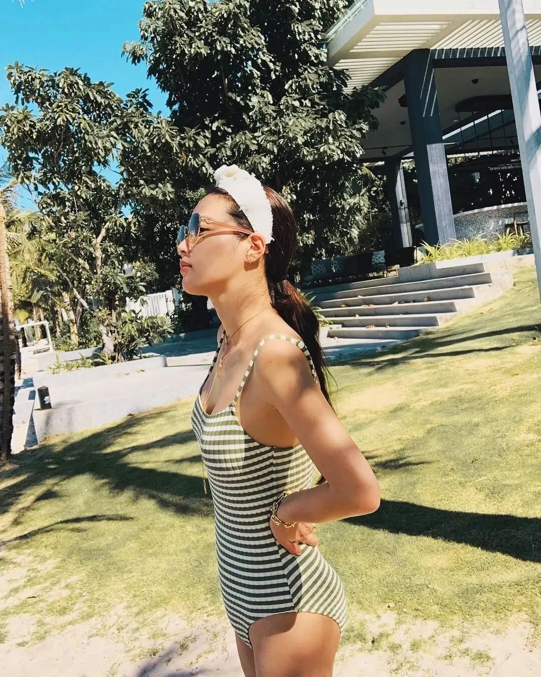 Jessica这次以黄色条纹收腰连体泳衣造型示人,手持咖啡色太阳镜,十足的夏威夷清爽feel~