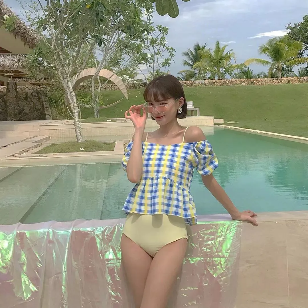 冰蓝色的格纹泳衣十分有看头