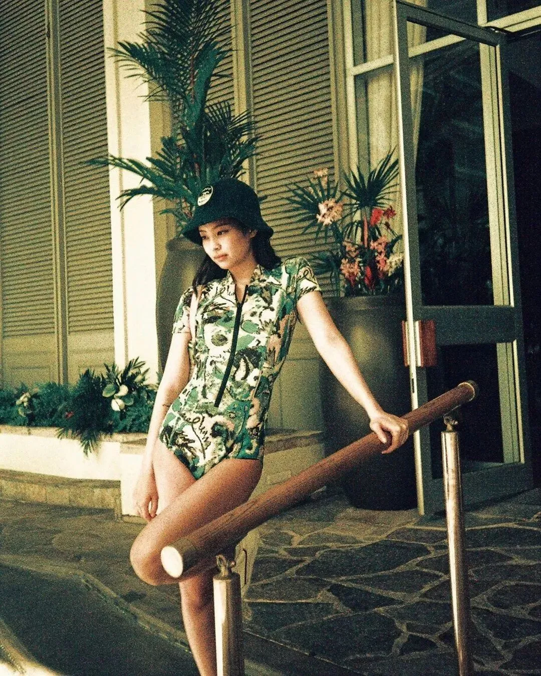 全球人气爆炸的Jennie,休假间以swimming bodysuits示人,最适合不过身材扁平但拥有腿长优势的瘦子啦