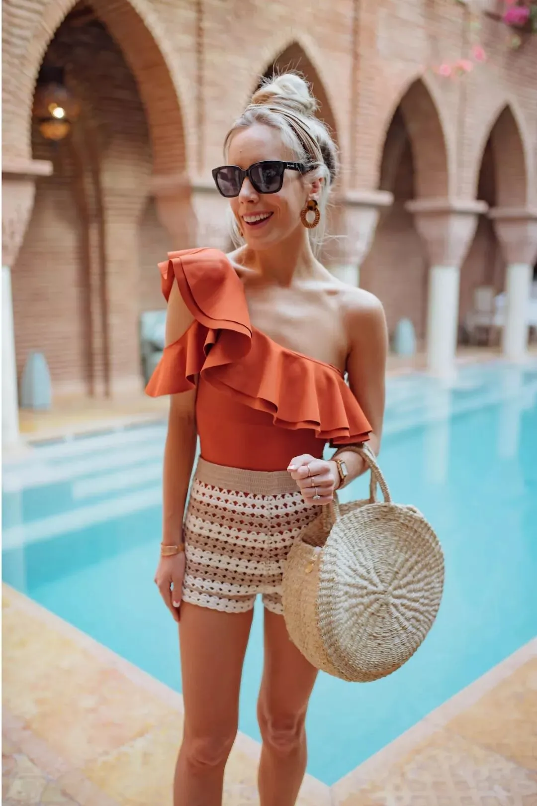 又可以从细节入手,选择单肩荷叶边连体泳衣,外穿镂空高腰短裤,手挽圆形草编包。