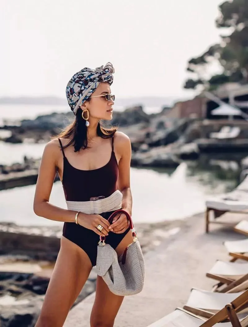 这种连体泳衣+宽腰带的穿法,易造型又出彩。