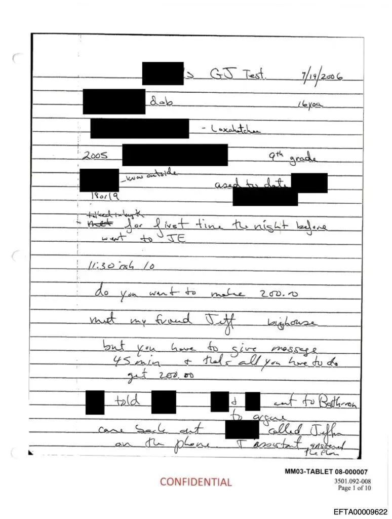 然而据文件显示,这名受害者反而与爱泼斯坦进行了“性活动”,爱泼斯坦让她“自己离开”。女孩起初拒绝了,但最终还是妥协了,她说:“我不在乎,因为我想要1500元”。就在这时,爱泼斯坦问她想不想赚1500元,文件中的这一明显提议被涂黑了。“我害怕说出来”。受害者写道。