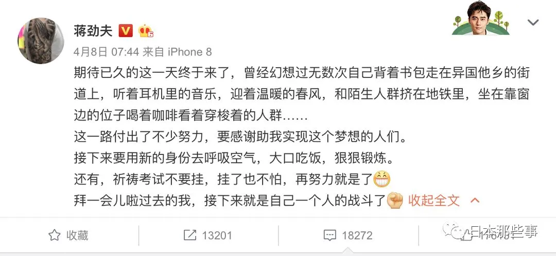 今年4月份,蒋劲夫在微博发布了自己将要去日本留学的消息……
