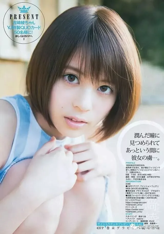 吉崎绫在日本被称为“福冈的奇迹”,她的父亲是日本人,但母亲却是菲律宾与西班牙混血,多方血统的混合造就了吉崎绫这带有独特魅力的脸庞,可爱却又不失魅惑。