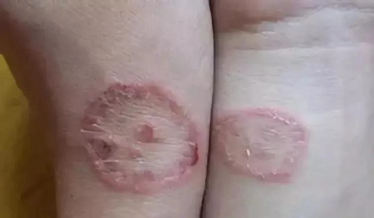 卜医生仔细检查了这两位姑娘的患处,发现双上肢和手腕部各有几处大小不等圆形的皮疹,有些像钱币一样,有些形成环状,可以看到一些鳞屑,身上和下肢没有类似皮疹。