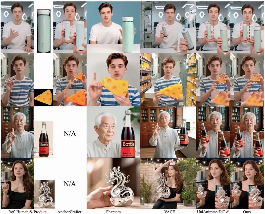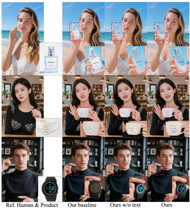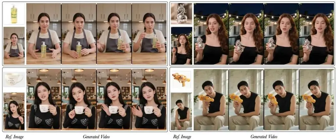 在电子商务和数字营销领域,生成高保真人机交互演示视频对于有效的产品展示至关重要。然而,大多数现有框架要么无法同时保留人和产品的身份,要么缺乏对人机交互空间关系的理解,导致呈现效果不真实,交互效果不自然。为了应对这些挑战,论文提出了一个基于扩散变换器 (DiT) 的框架。该方法通过注入成对的人机交互参考信息并利用额外的遮罩交叉注意力机制,同时保留了人机交互和产品特定细节,例如徽标和纹理。