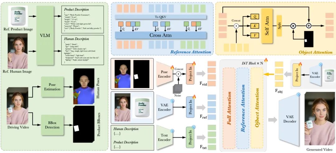 DreamActor-H1 的流程采用 DiT 架构,首先进行数据集准备,其中 VLM 描述产品和人体图像,然后对训练视频进行姿态估计和边界框检测。在训练过程中,人体姿态和产品边界框与视频噪声相结合,用于运动引导;而 VAE 对输入图像进行编码,用于外观引导;人体-产品描述通过文本编码器输入模型。该模型融合了完全注意力机制、参考注意力机制和对象注意力机制(以产品潜在变量作为输入),其中参考注意力机制和对象注意力机制详见上图。
