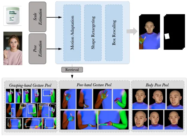 在推理过程中,该框架从预定义的池中检索最佳运动模板,并通过参考人体/产品图像的联合分析来调整对象框缩放,从而实现姿势一致的动画。