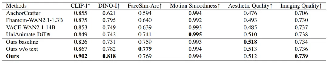与 AnchorCrafter、Phantom、VACE 和 UniAnimate-DiT 进行比较。注意论文只为 AnchorCrafter 生成了 3 个视频,而 UniAnimate-DiT 使用前几帧和姿势序列作为输入。与 AnchorCrafter、Phantom、VACE、UniAnimate-DiT以及我们的消融研究(“我们的基线”和“我们的无文本研究”)进行定量比较。注意,我们使用我们的初始帧和姿势序列作为 UniAnimate-DiT 的输入。