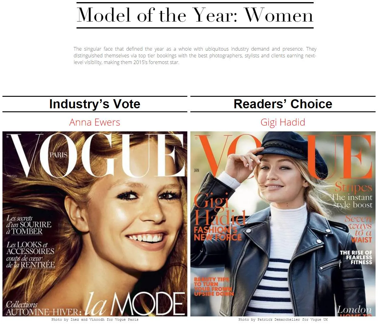 令人意外2015年度业界女模特儿“Model of the Year Industry Awards”(简称”MOTY”)由德国一位新晋超模截获,而不是由人气炒得超高的Gigi Hadid或Kendall Jenner,她竟然打败了带满各种光环的星二代,究竟是业界良心发现抑或这位德国超模本身就魅力无法挡?