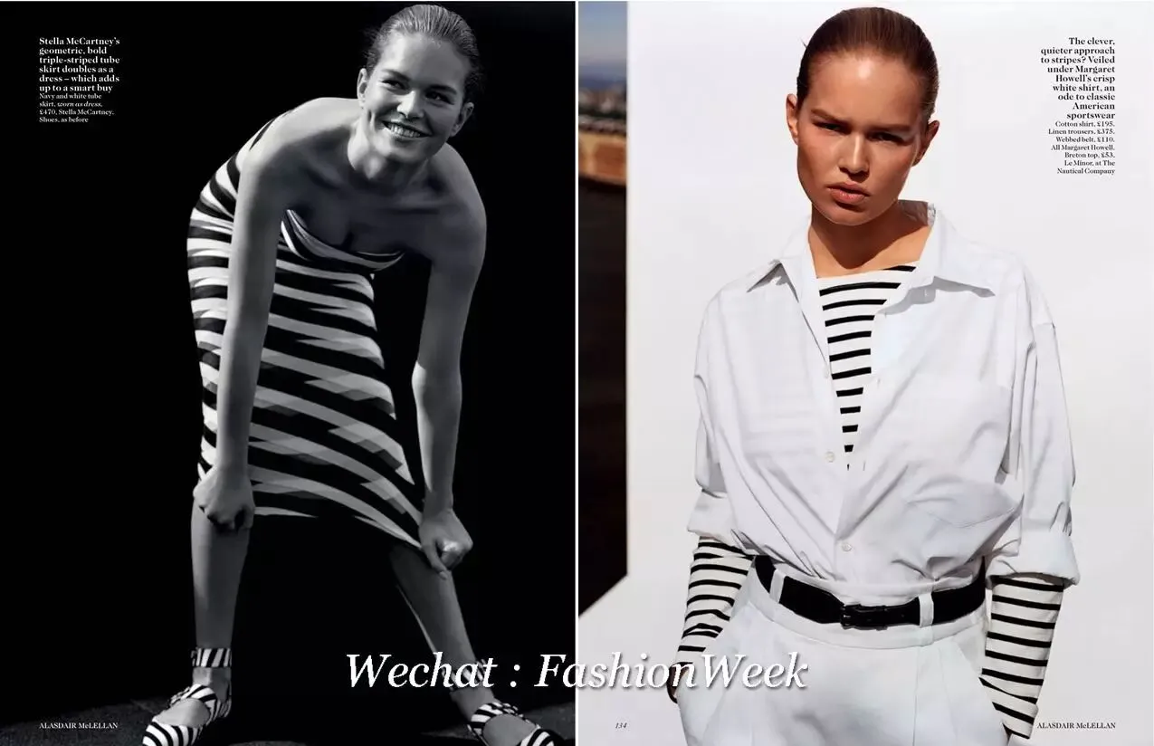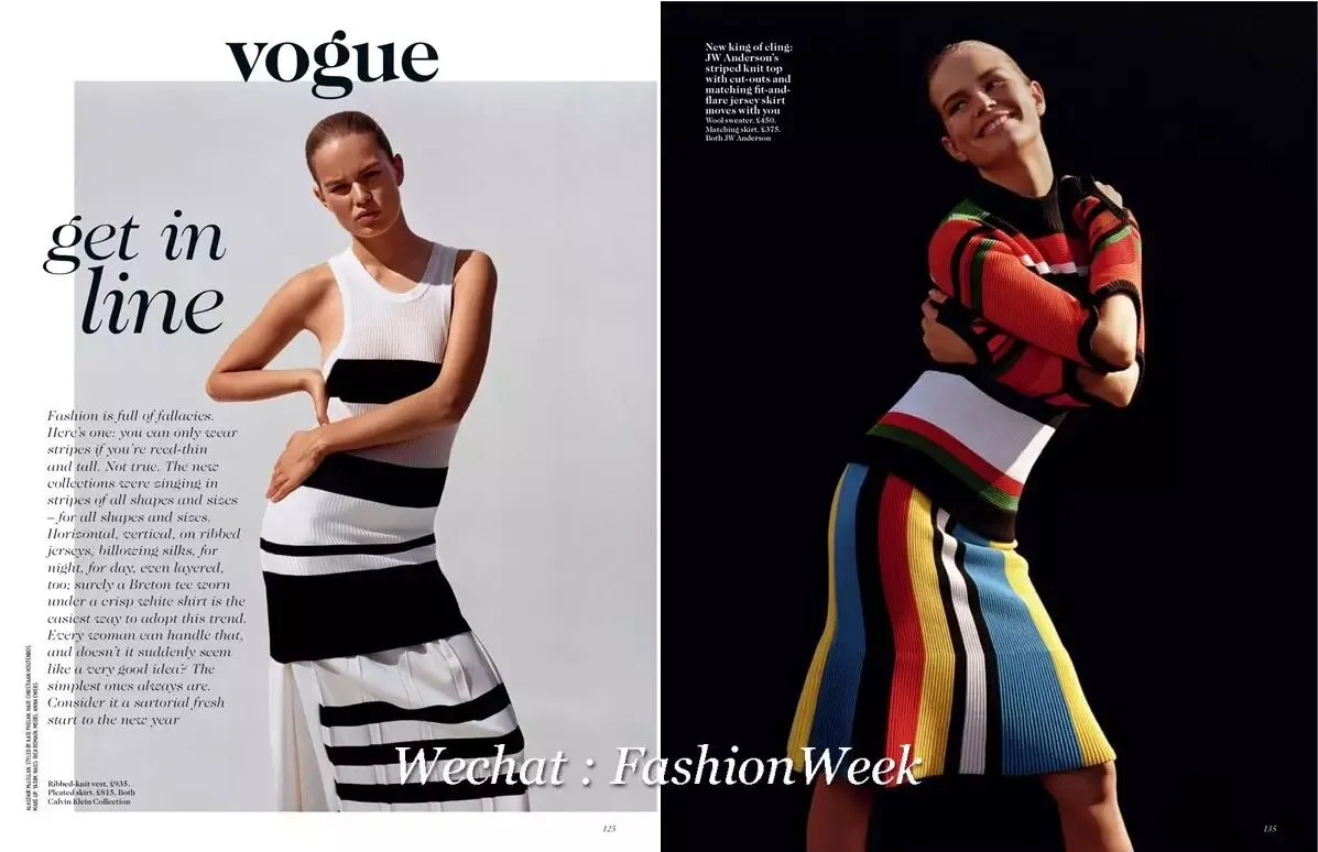 在2016年月份的《Vogue》UK版中由摄影师Alasdair McLellan拍摄的以条纹为主题的作品,一共有十四页,Anna 大背头既性感又帅气,英姿飒爽。