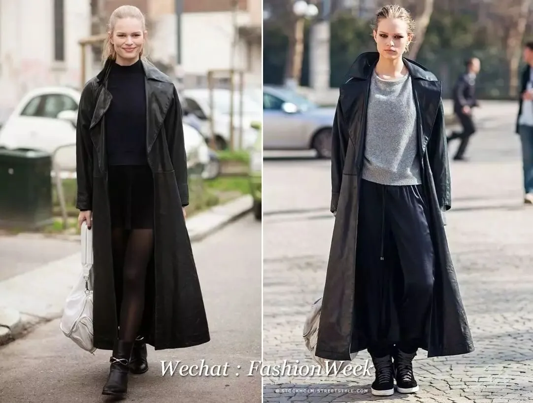 女杀手出现了,可以看得出利用一件超长黑色风衣的好处,精心搭配的All black造型或者穿着睡衣和运动裤、鞋冲忙赶场LOOK,随便一披上,就帅炸。