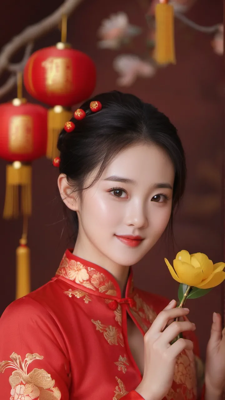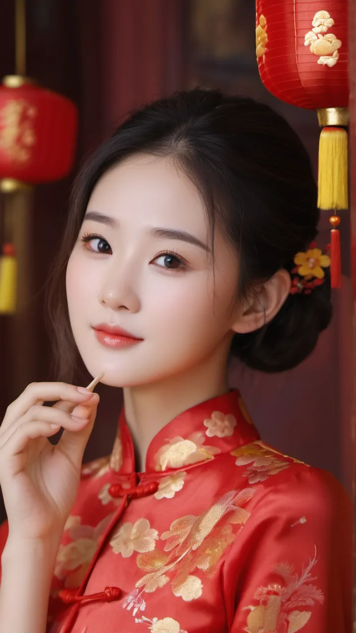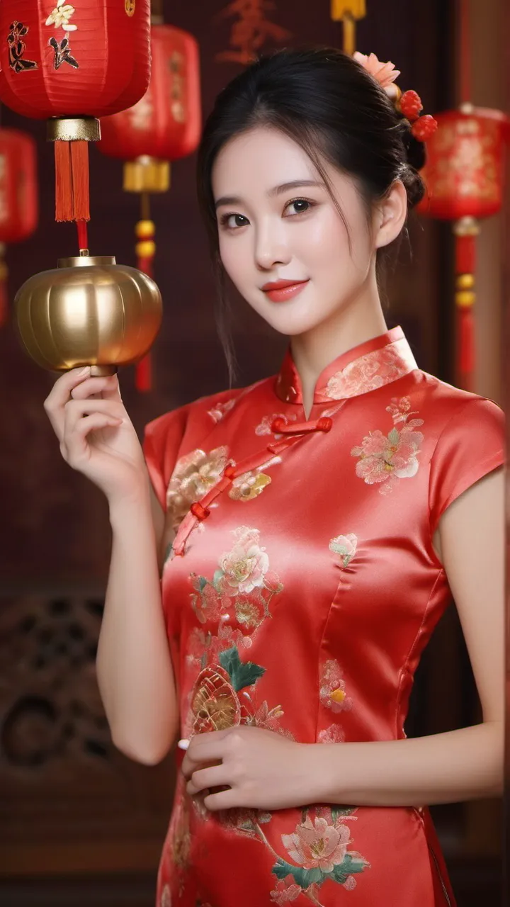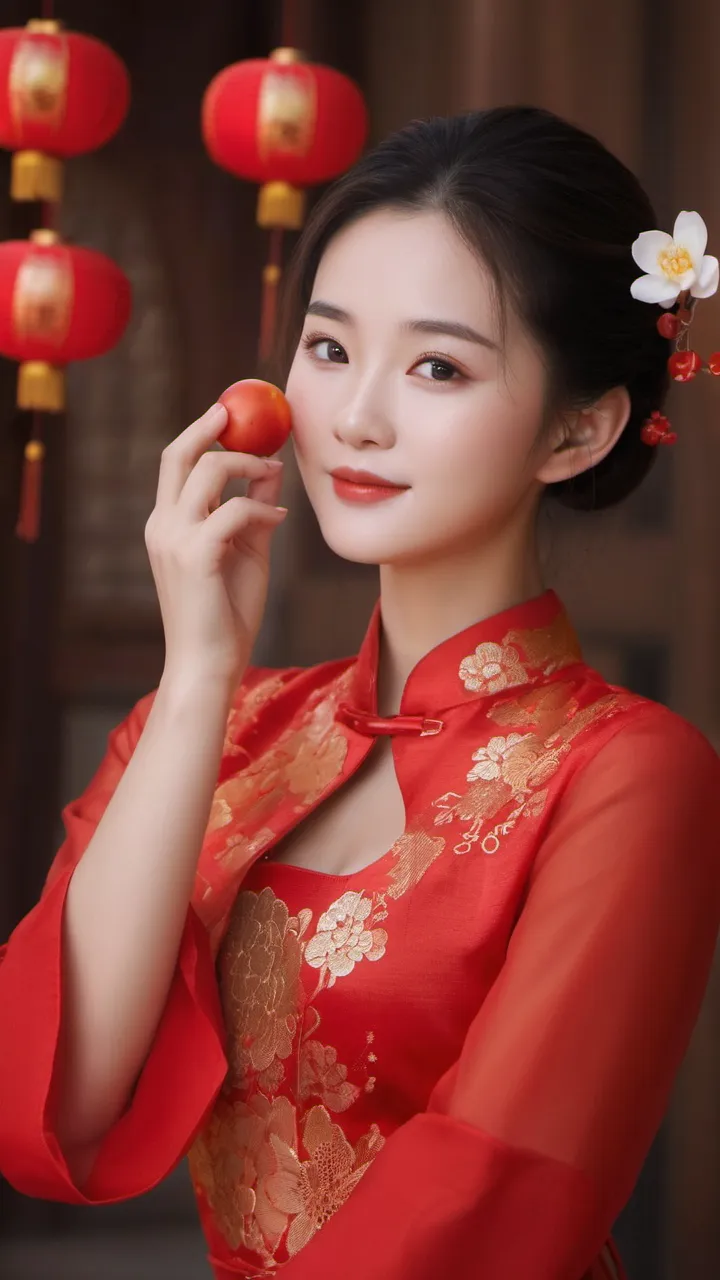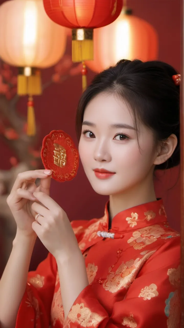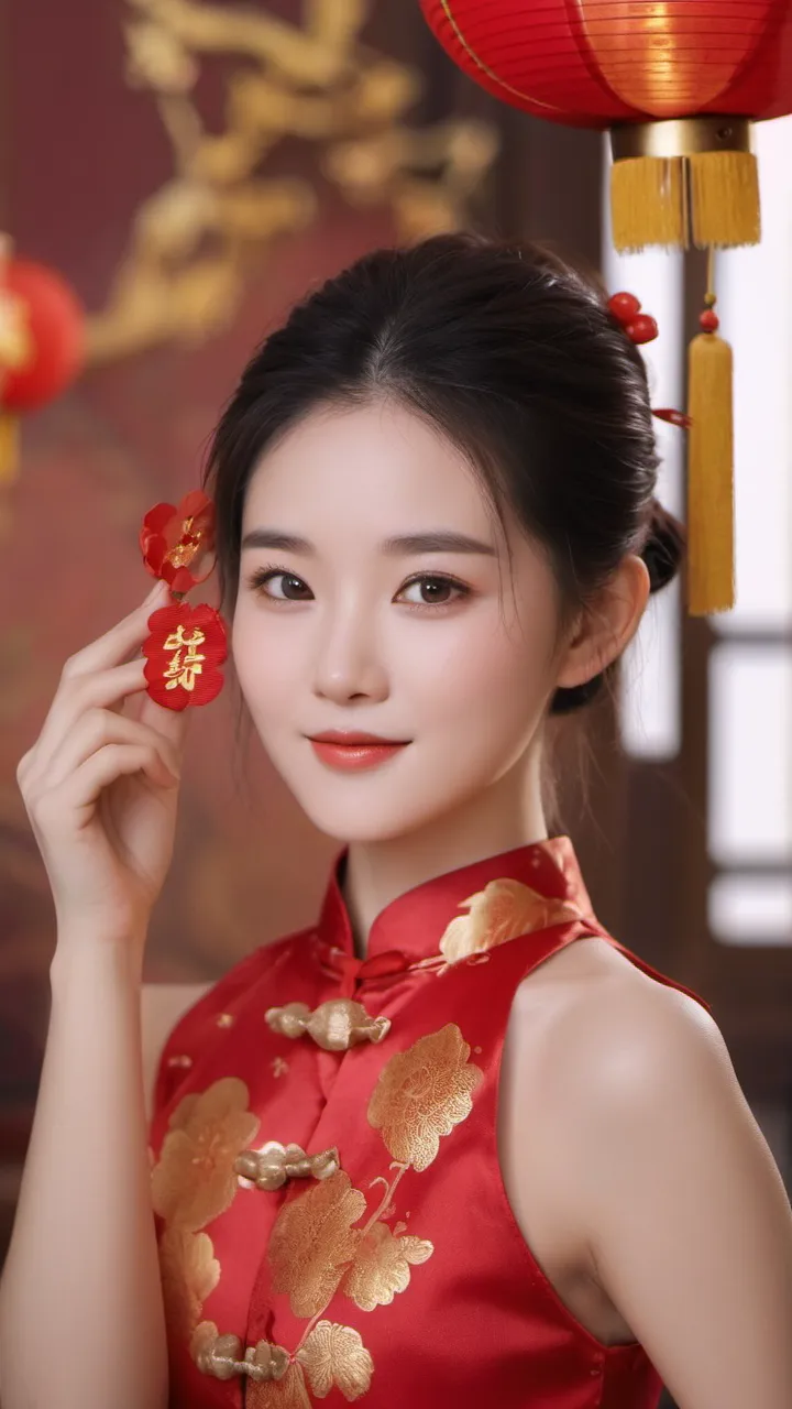 在背景的选择上,摄影师选择了具有中国传统特色的红色墙壁和挂饰。这些元素不仅为画面增添了文化气息,也让人联想到热闹非凡的新年佳节。背景的红色与女子旗袍的颜色相互映衬,形成了和谐的色调搭配。