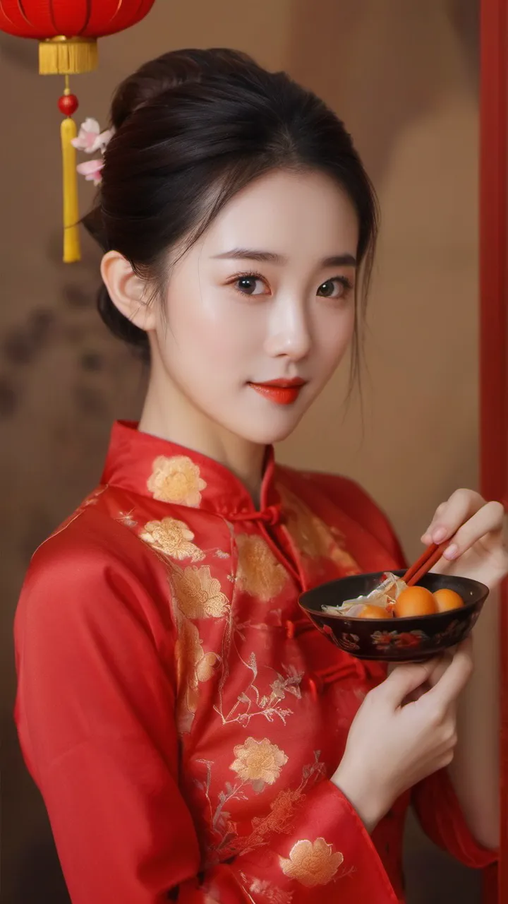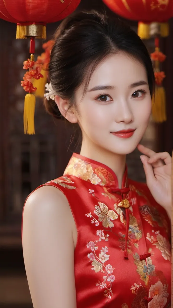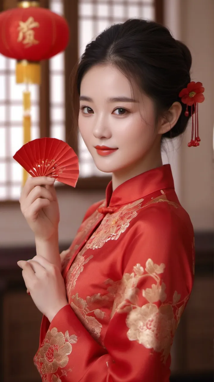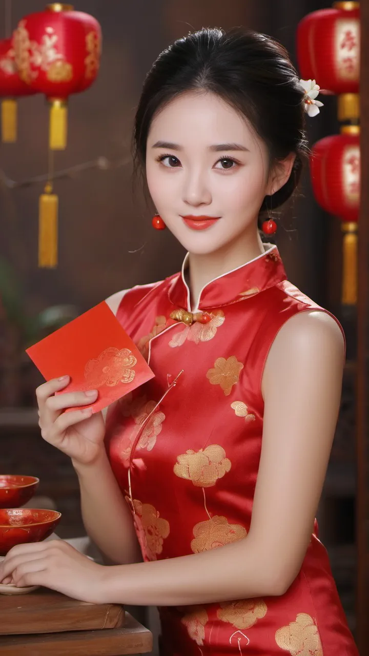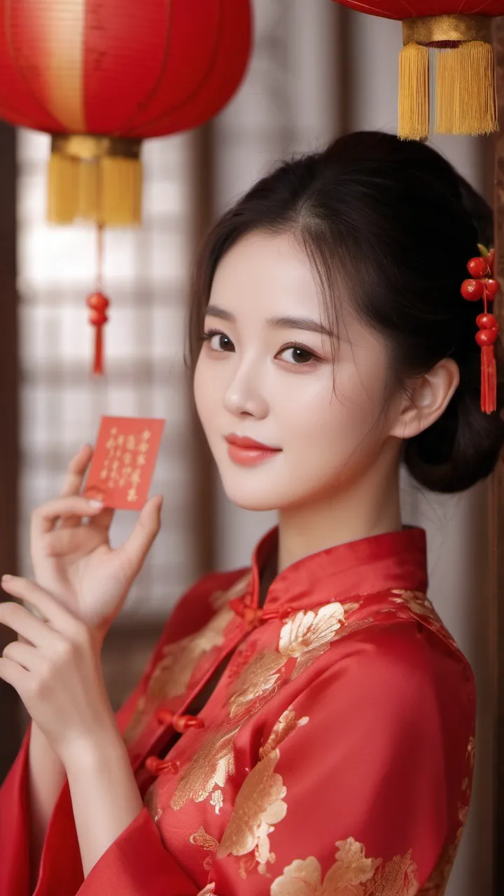 在背景的选择上,摄影师选择了具有中国传统特色的红色墙壁和挂饰。这些元素不仅为画面增添了文化气息,也让人联想到热闹非凡的新年佳节。背景的红色与女子旗袍的颜色相互映衬,形成了和谐的色调搭配。
