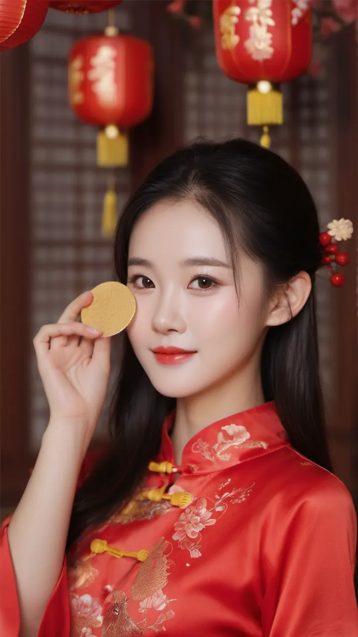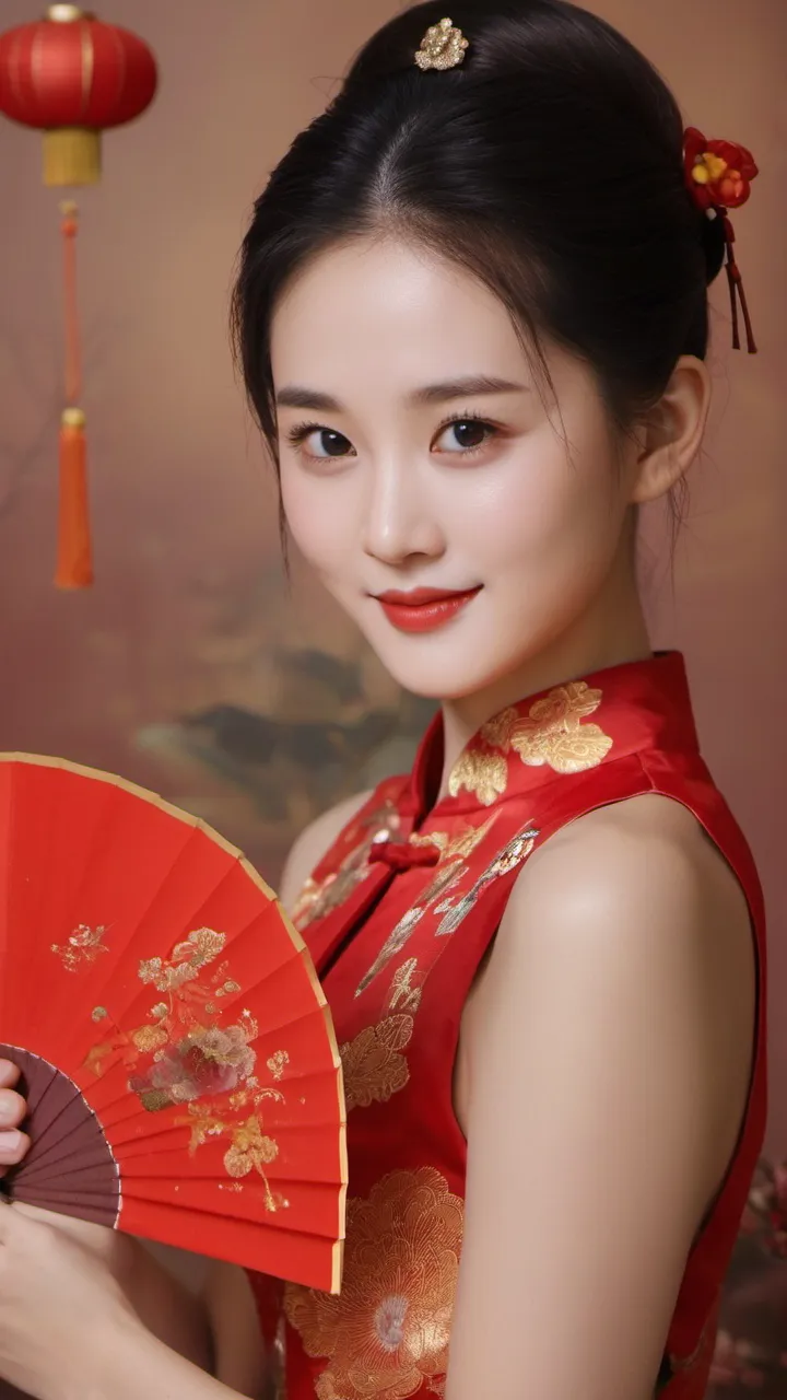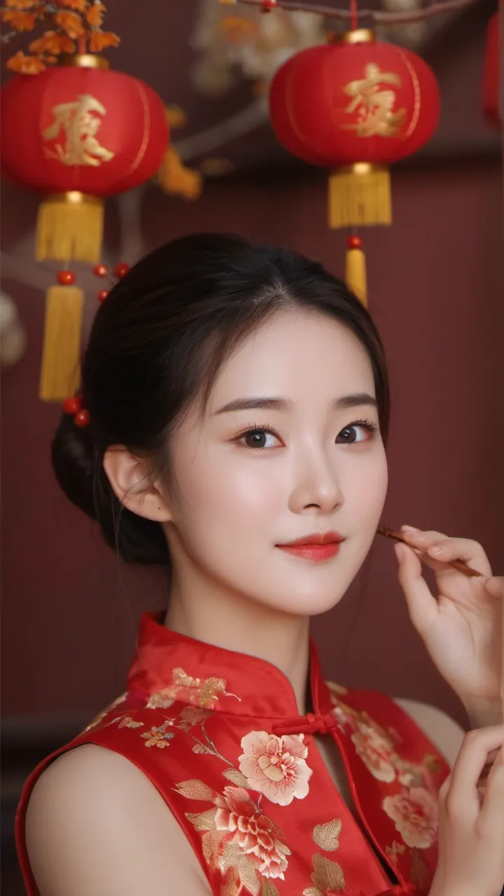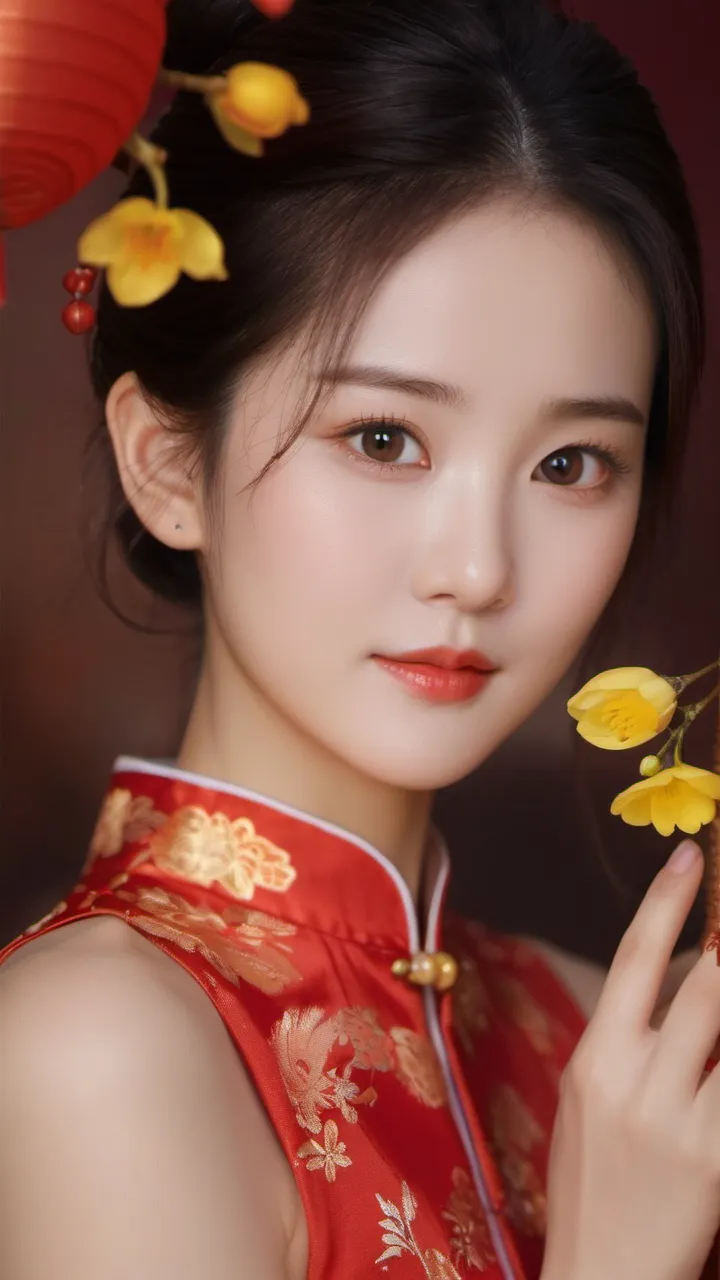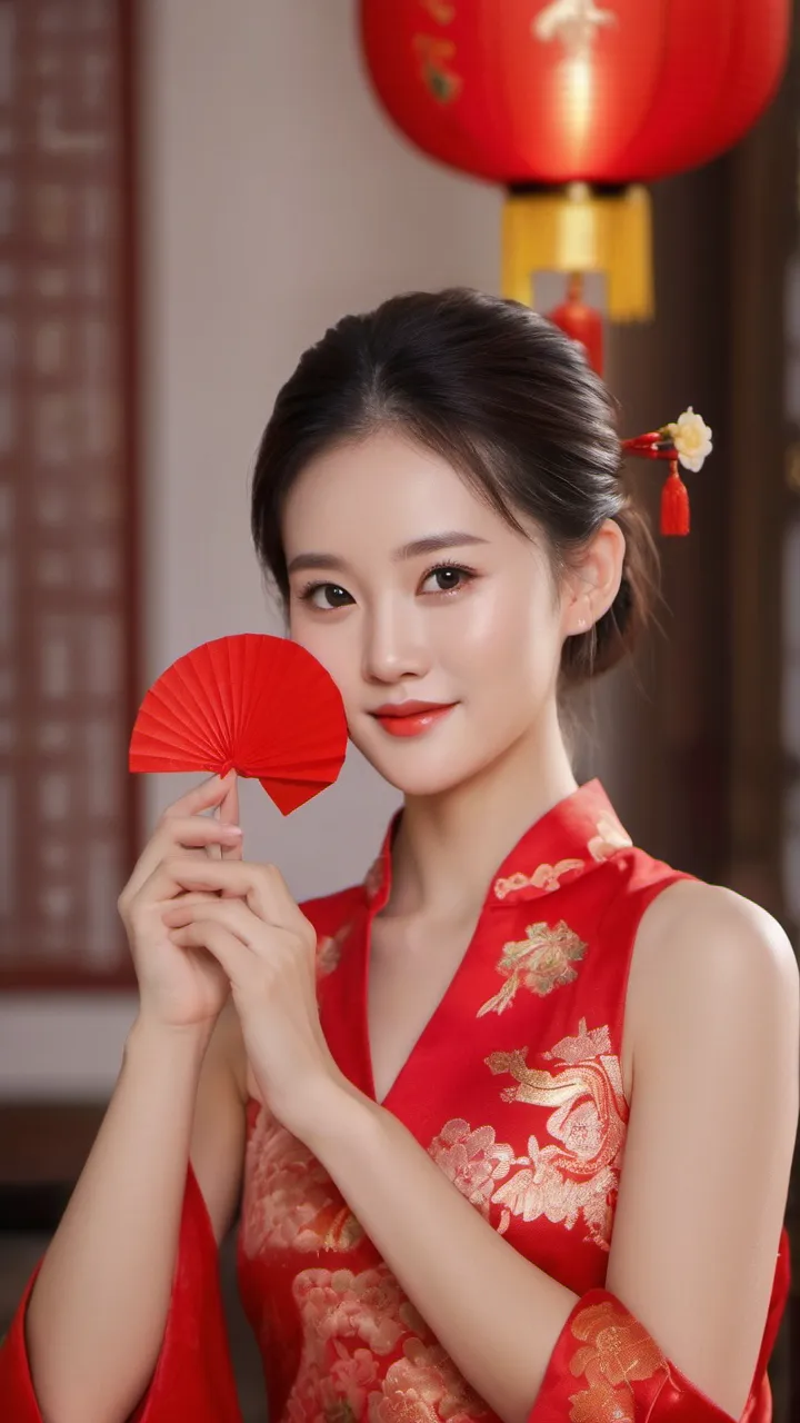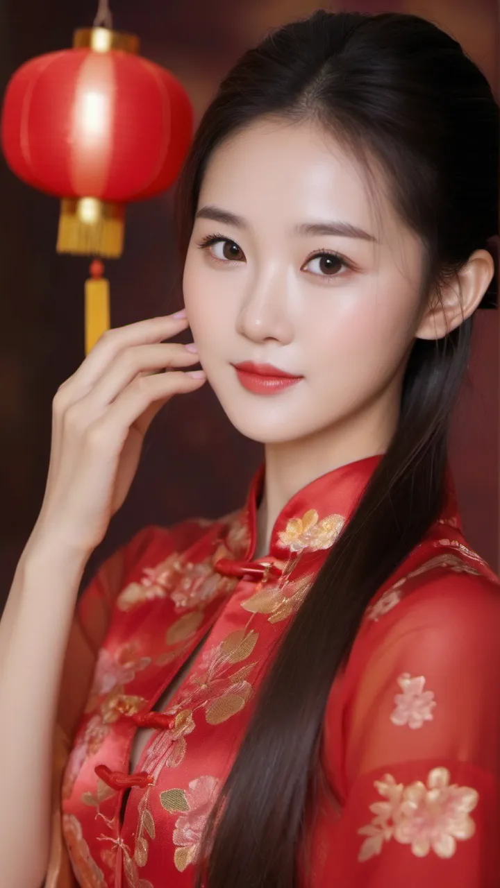 在背景的选择上,摄影师选择了具有中国传统特色的红色墙壁和挂饰。这些元素不仅为画面增添了文化气息,也让人联想到热闹非凡的新年佳节。背景的红色与女子旗袍的颜色相互映衬,形成了和谐的色调搭配。