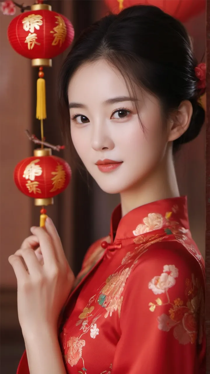 这些作品是一张充满节日氛围的肖像摄影,通过展示一位年轻女子身着传统红色旗袍,手持红灯笼和“福”字装饰,巧妙地将中国新年庆祝活动中的典型元素融入画面。在画面中,背景为红色的墙壁和挂饰,与女子的服装相得益彰。灯笼和“福”字分别象征着光明、希望和好运,是春节期间必不可少的装饰品。女子面带微笑,眼神温柔,展现出愉悦的心情和对新年的期待。她的姿态优雅自然,仿佛在向观众传递着温暖祝福。整体构图简洁而富有诗意,充分展现了摄影师捕捉瞬间美感的能力。