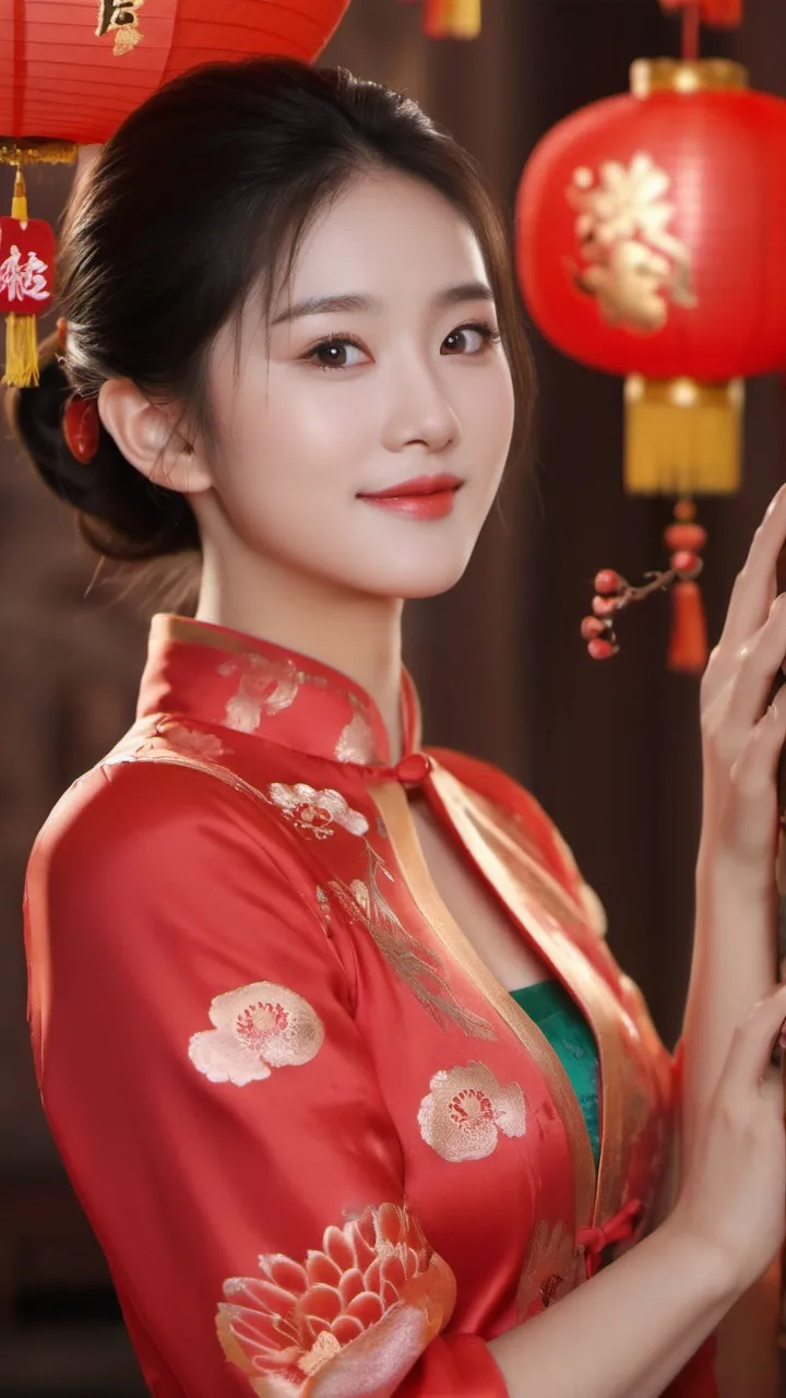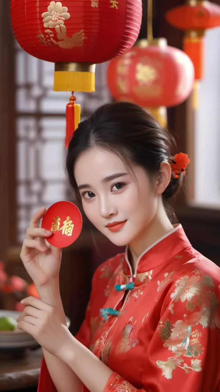 从主题和叙事角度来看,这些作品传达了新春佳节的热闹氛围和家庭团圆的美好愿景。女子手持红灯笼和“福”字,代表着人们对新的一年的期望和祝福。她面带微笑的表情和优雅的姿态,展示了生活中的美好瞬间。整体而言,这些作品通过对人物形象的描绘、色彩搭配、光影运用等方面的精心处理,成功地传递出欢乐、和谐、温馨的情感,让观者在欣赏的同时也能感受到节日的喜庆气氛。