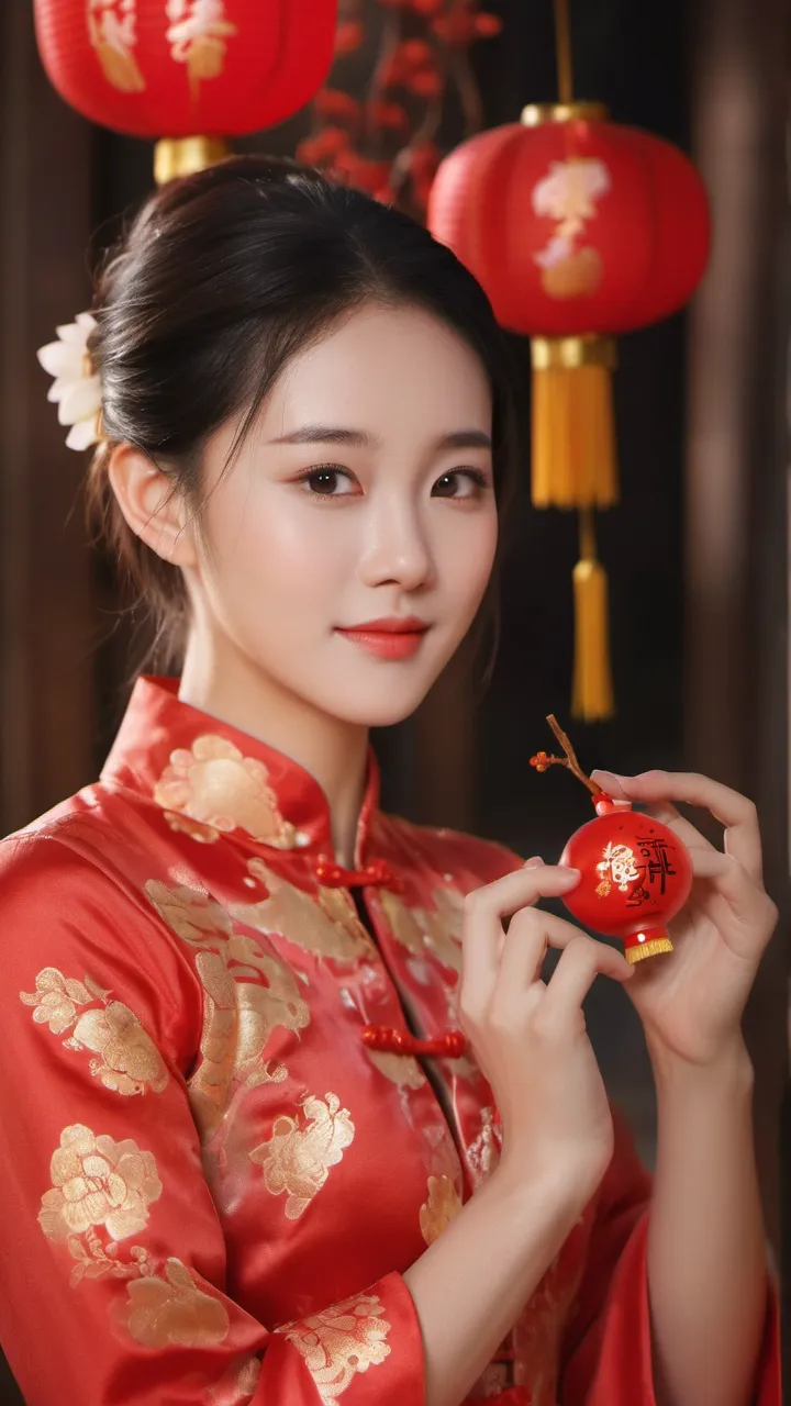 在这些作品中,摄影师巧妙地将中国传统元素与现代摄影技术相结合,展现了一种独特的艺术风格。首先,摄影师运用了浅景深技巧,将观者的注意力集中到女子身上,使画面更具立体感。其次,他合理安排了画面中的色彩和光影,使整个画面充满了节日氛围。最后,摄影师通过捕捉女子微笑的表情和优雅的姿态,传递出对新年的喜悦和期待。综合运用这些技巧,使得这些作品在视觉上更具吸引力,同时也传达了深刻的情感内涵。