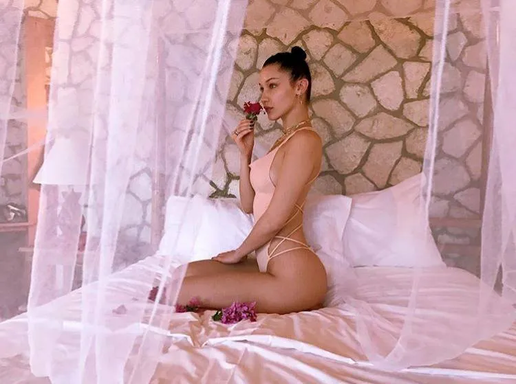 除了字母连体泳衣,Bella Hadid也偏爱其他类型的连体泳衣,比如这件绑带剪裁的肤色连体泳衣就将她的好身材展露了淋漓尽致。