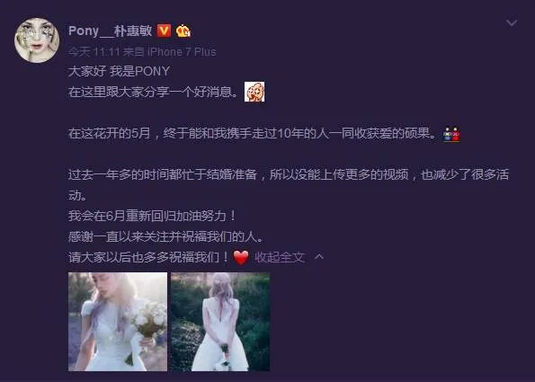 拥有韩国国内美妆油管第1人头衔的Pony即将结束与男友长达10年的恋爱长跑,携手步入婚姻的殿堂.9日Pony更新个人IG表示“花开的5月,和我一起走过了漫长的10年岁月的人,与他的爱情将结出美丽的果实.请大家多多祝福我们~”