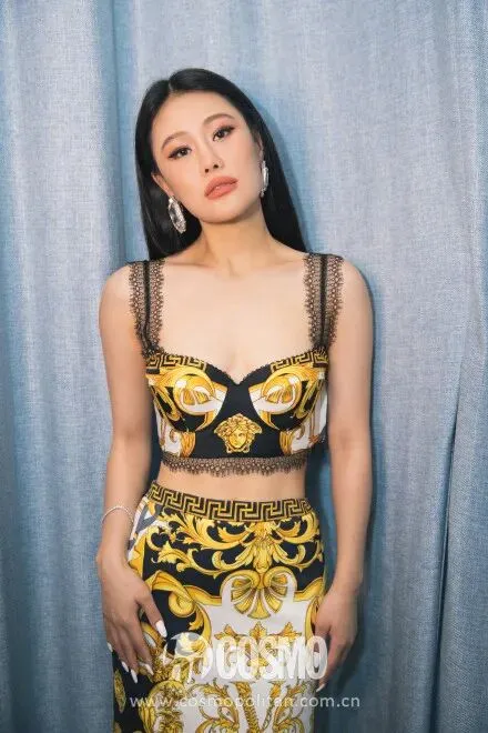 张萌的上衣远看像件肚兜,近看却是件拼接设计top,呈现萌萌子的“野性”魅力。