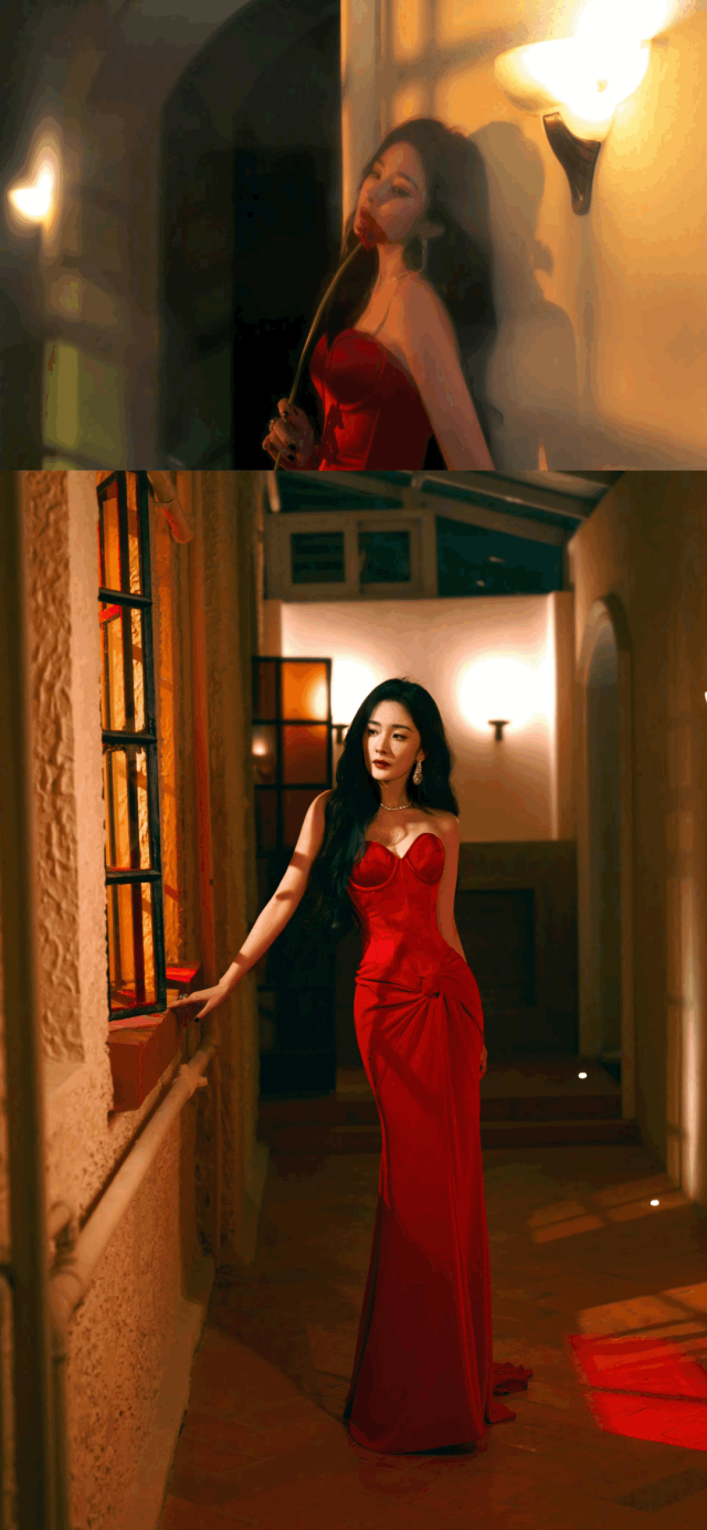 亦或是黑色高开叉长裙加身,气场直接拉满,高开叉尽情展现腿部线条,上半身鱼骨胸衣勾勒腰线,简单纯黑色也足够打动人。