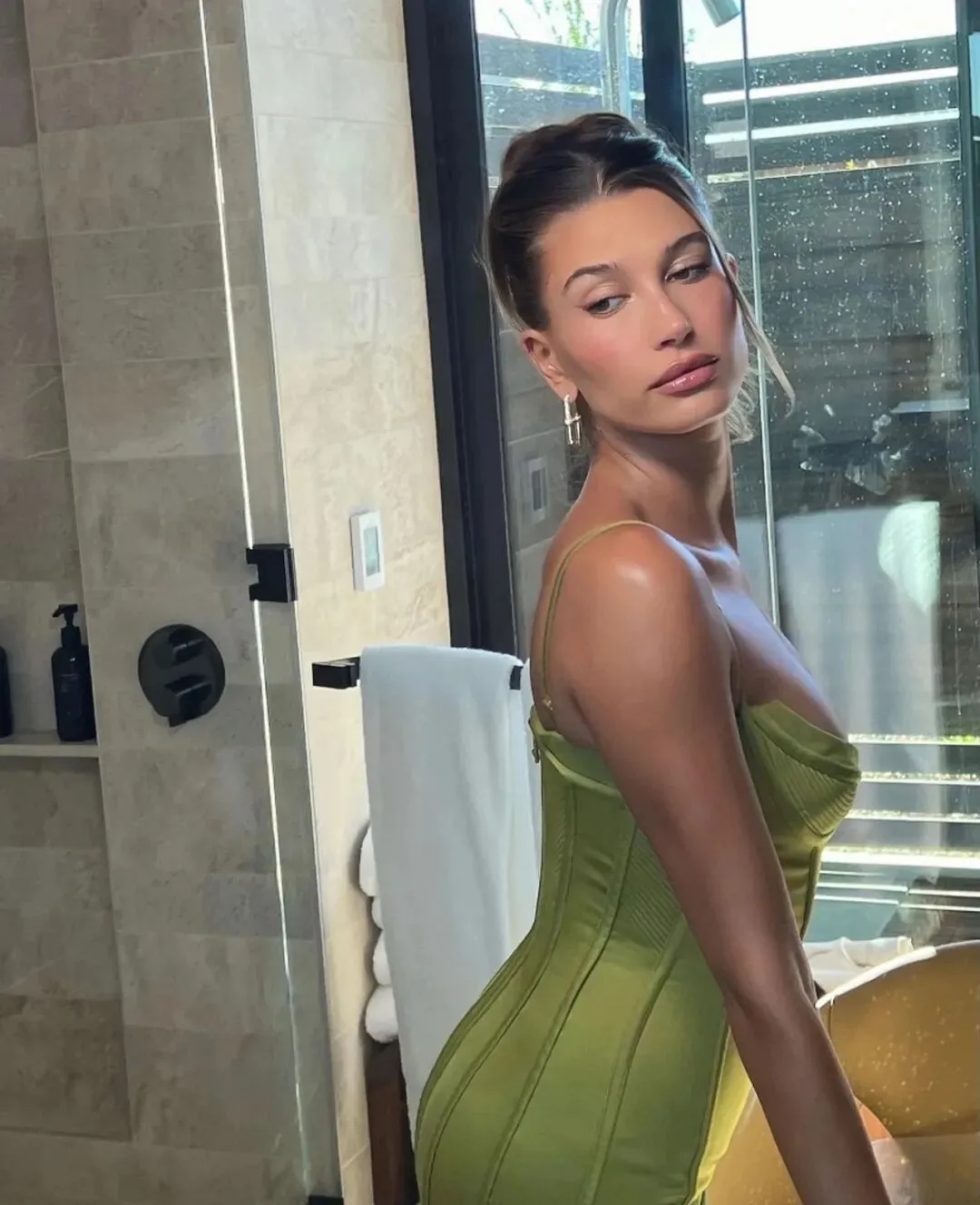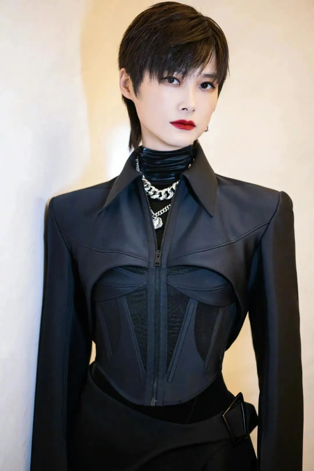 春春对于鱼骨胸衣得演绎也颇有心得,大垫肩加极致收腰,搭配红唇演绎超A气场。
