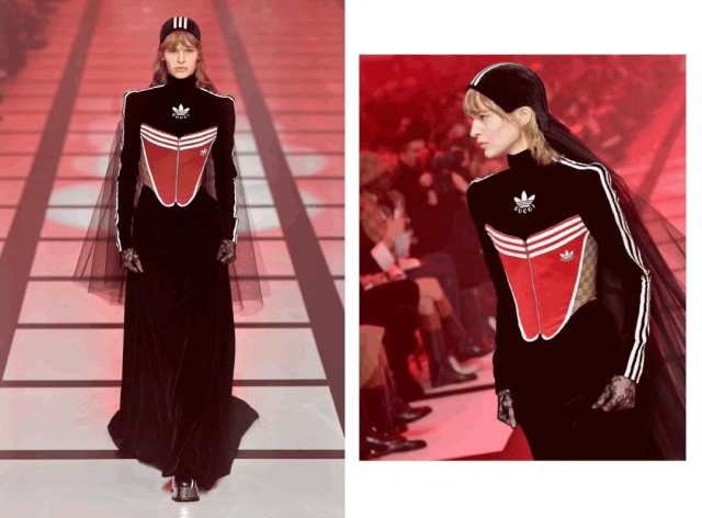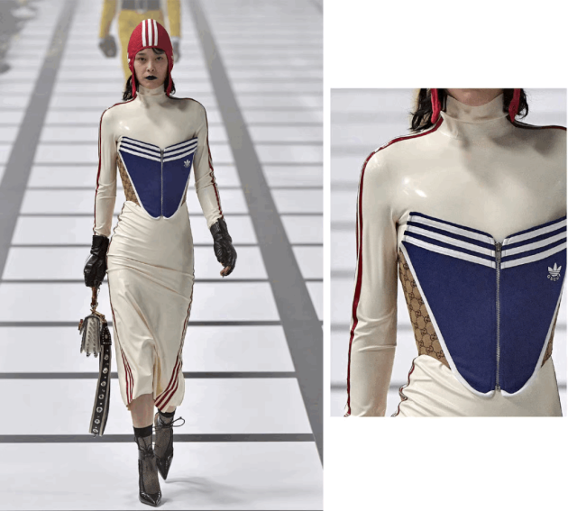 本次联名系列把三叶草logo 与标志性三条杠为设计元素与 GUCCI 浪漫优雅相结合,加上经典老花的映衬,鱼骨胸衣的性感与休闲运动风组合搭配得刚好。